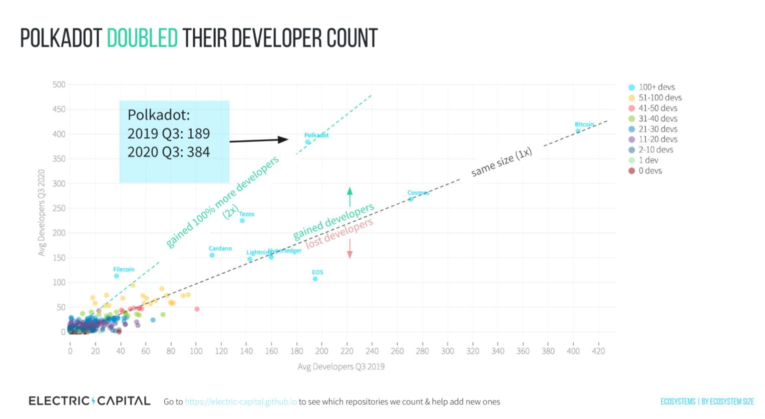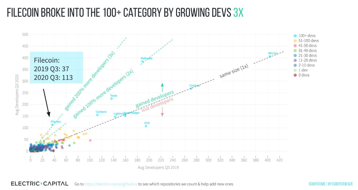 Electric Capital tarafından yapılan araştırmaya göre, liderlik koltuğunda ilk sıralarda oturan kripto paralardan Bitcoin (BTC) ve Ethereum (ETH) söz konusu olduğunda girişimcilerin seçimi Ether oldu. 2020 yılının ilk üç çeyreğinde Ethereum ağındaki aylık aktif geliştirici sayısı ortalama 2 bin 300 olarak açıklanırken; Bitcoin için aynı ölçüt 400 geliştiricide kaldı. Araştırmaya göre geliştirici sayısı artarda 3 ay boyunca artış gösterdi ve bu durum 2017’den beri bir ilk olarak nitelendirildi. Aynı rapora göre, bu sene katlanarak büyüyen geliştiriciye sahip başka birçok proje de bulunuyor.